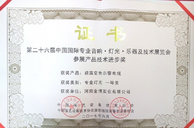 2017 PALM展共有50多家家企業(yè)100多項(xiàng)產(chǎn)品積極申報(bào)了了產(chǎn)品技術(shù)進(jìn)步獎(jiǎng)的各類獎(jiǎng)項(xiàng)。經(jīng)展會(huì)主辦方-中國(guó)演藝設(shè)備技術(shù)協(xié)會(huì)技術(shù)部門的初審,以及協(xié)會(huì)專家團(tuán)隊(duì)在展會(huì)上的現(xiàn)場(chǎng)評(píng)審,河南金博實(shí)業(yè)有限公司的“感溫變色示警電纜”產(chǎn)品 榮獲***燈光 一等獎(jiǎng)。